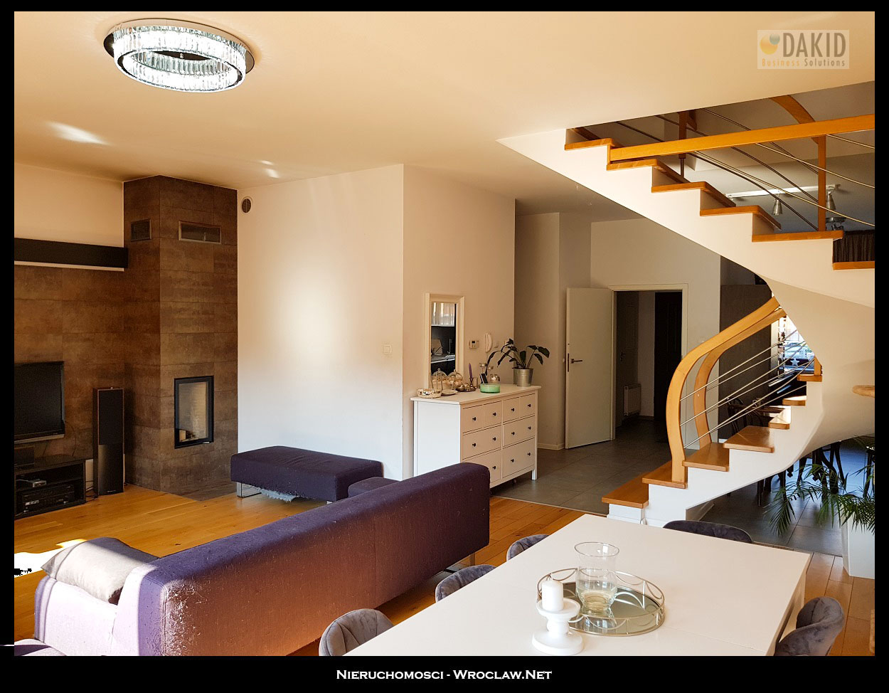 Sercem domu jest ponad 50m2 salon z wyjściem na słoneczny taras z dużymi panoramicznymi oknami. Salon przestronny połączony z aneksem kuchennym oraz z zamontowanym kominkiem w rogu. Na kolejną kondygnacje prowadzą drewniane schody. Dodatkową ozdobą salonu jest plafon leedowy, szklane włączniki dotykowe oraz kryształowe kinkiety na ścianie. W całym domu zamontowano jasne drewniane podłogi, drewniane okna, białe listwy przypodłogowe.
