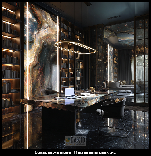 Wersja czarnego biura z włoskimi kaflami ceramicznymi, kamiennym biurkiem oraz